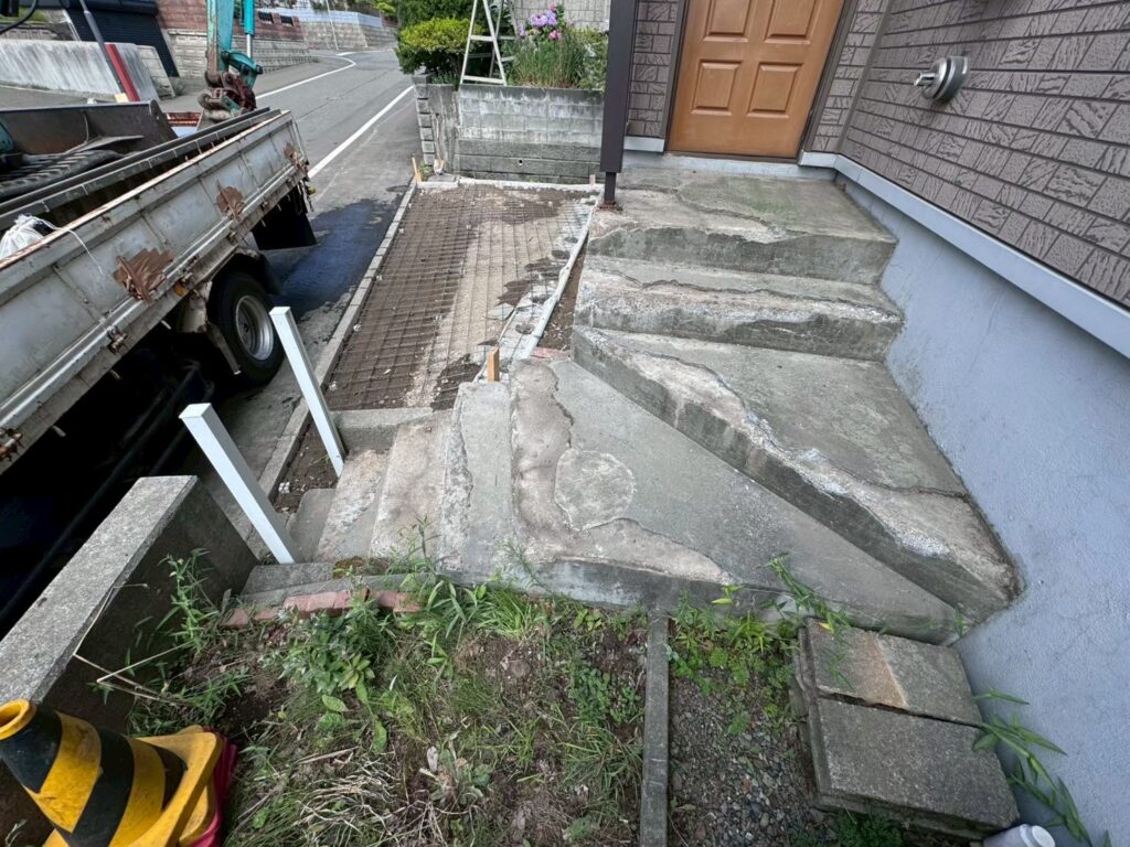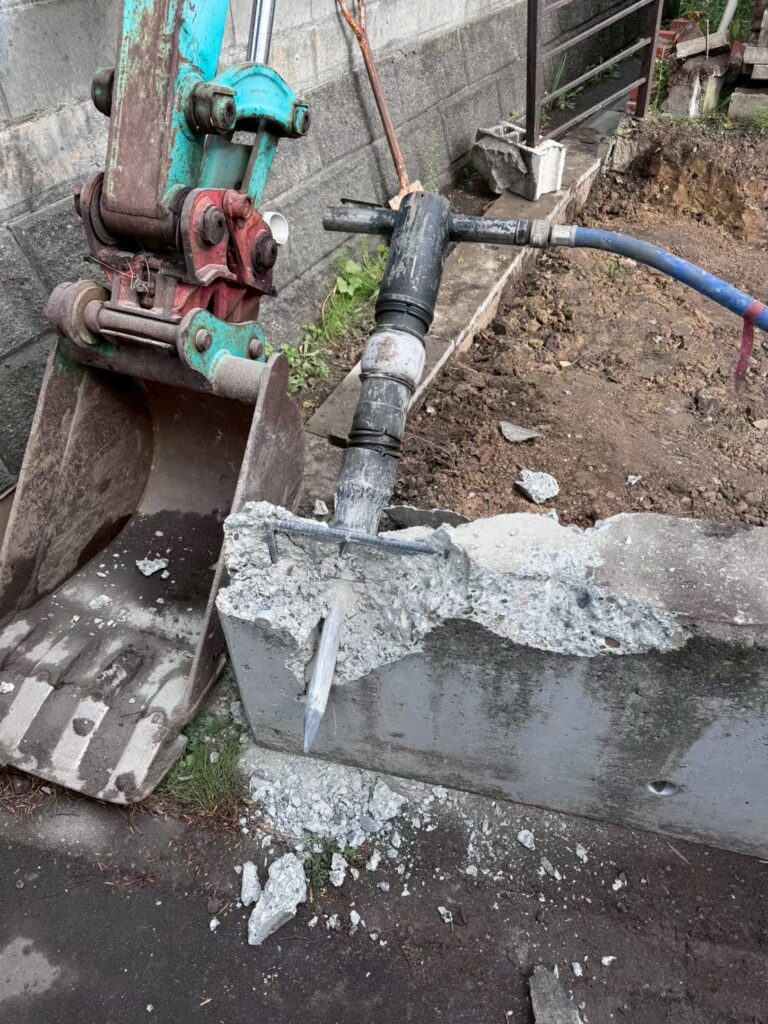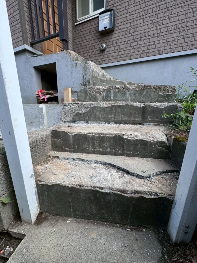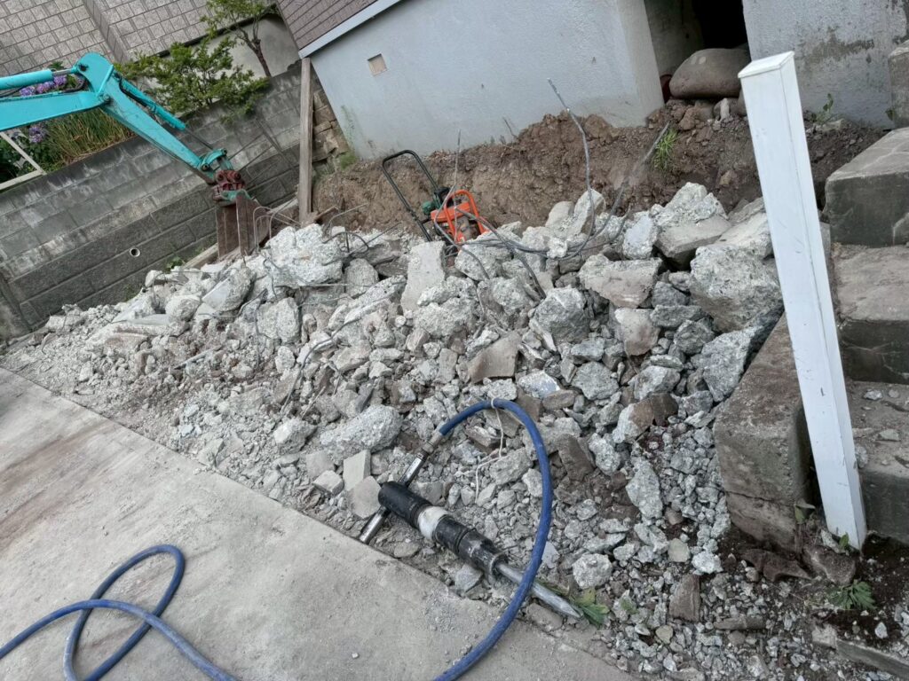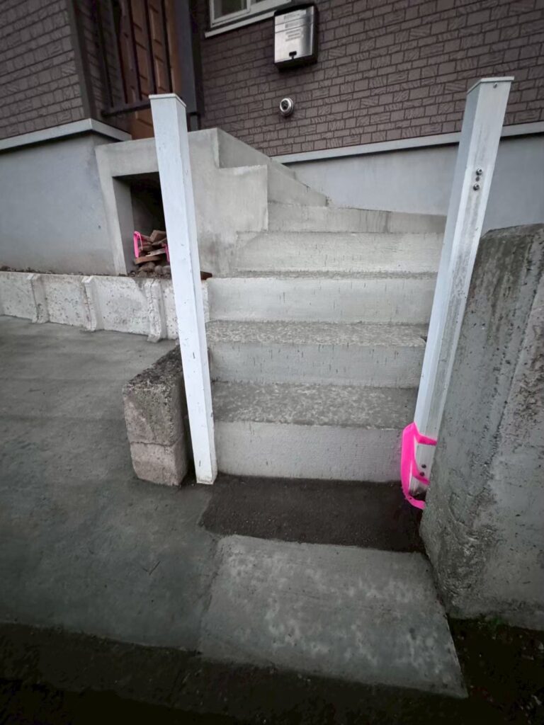 施工名コンクリート擁壁施工施工場所札幌市厚別区施工期間約2週間コメント残土掘削・コンクリート擁壁撤去・コンクリート土間打設。コンクリート階段の割れたところをはつってモルタル補修を行いました。コンセプトです。 施工前 施工中 施工後